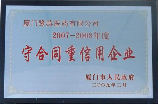 近日,廈門(mén)鷺燕醫(yī)藥有限公司、廈門(mén)鷺燕大藥房有限公司在廈門(mén)市工商行政管理局組織的 “廈門(mén)市2007—2008年度‘守合同,重信用’”評(píng)比活動(dòng)中榜上有名,這是鷺燕集團(tuán)旗下子公司繼05-06年度之后再次獲此殊榮。