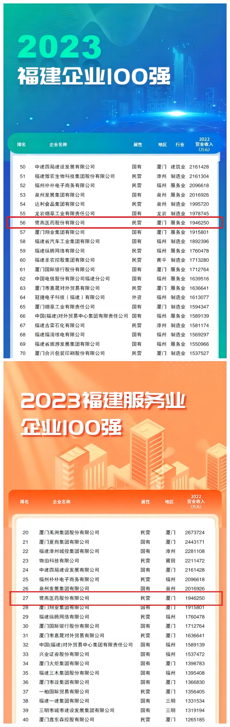 鷺燕醫(yī)藥股份有限公司本次榮登《2023福建企業(yè)100強(qiáng)》榜單第56位、在《福建服務(wù)業(yè)企業(yè)100強(qiáng)》排名第27位!