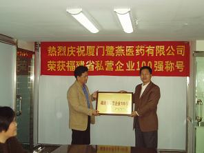 由福建省私營企業(yè)協(xié)會、福建日報(bào)社聯(lián)合開展的2005年度“福建省私營企業(yè)100強(qiáng)”評定活動,于近日揭曉最終入圍企業(yè),廈門鷺燕醫(yī)藥有限公司榜上有名。今天,市工商局的領(lǐng)導(dǎo)來我司進(jìn)行了授牌儀式。儀式上,吳金祥總裁向領(lǐng)導(dǎo)們介紹了鷺燕的成長歷程,并對將來的經(jīng)營進(jìn)行了展望。領(lǐng)導(dǎo)們在聽取了吳總裁的匯報(bào)后,肯定了鷺燕的發(fā)展模式,同時(shí),也對鷺燕的可持續(xù)發(fā)展提出了許多有益的建議。